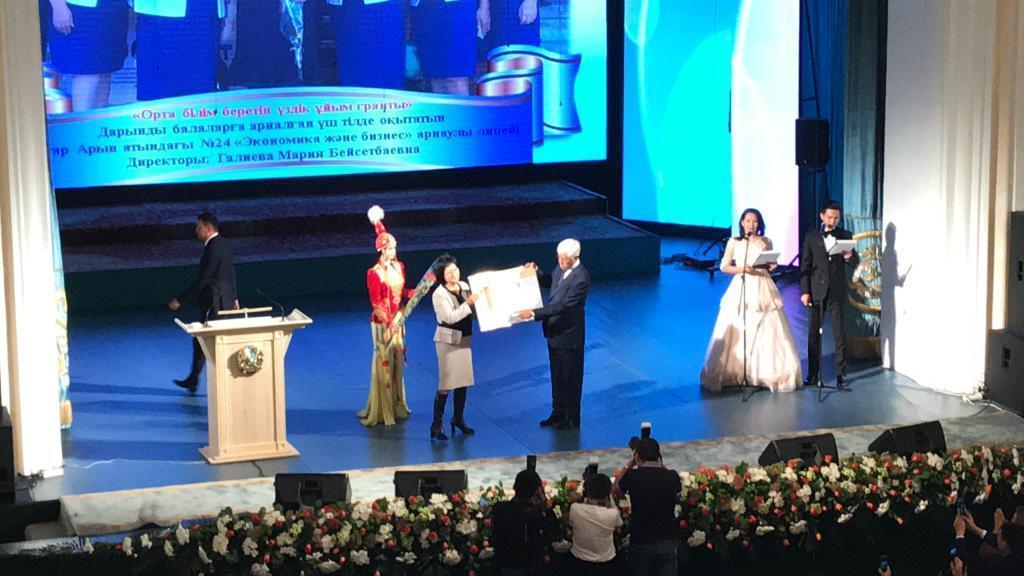 Салтанатты жиын барысында ұстаздарды кәсіби мерекелерімен құттықтаған облыс әкімі Амандық Ғаббасұлы Баталов білім және ғылым жолында аянбай еңбек етіп келе жатқан Талдықорған қаласының «Дарынды балаларға арналған үш тілде оқытатын Мұхтар Арын атындағы №24 «Экономика және бизнес» арнаулы лицей директоры Галиева Мариям Бейсетбаевнаға «Орта білім беретін үздік ұйым» грантының сертификатын табыстады. Лицейіміздің мәртебесі асқақтай беретініне сенімдіміз. Жеңісіміз құтты болсын! Мерекелеріңіз құтты болсын, құрметті әріптестер!